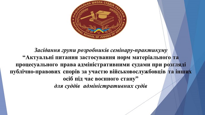 13 жовтня 2023 року Національна школа суддів України провела чергове засідання групи розробників семінару-практикуму “Актуальні питання застосування норм матеріального та процесуального права адміністративними судами при розгляді публічно-правових спорів за участю військовослужбовців та інших осіб під час воєнного стану” для суддів адміністративних судів.