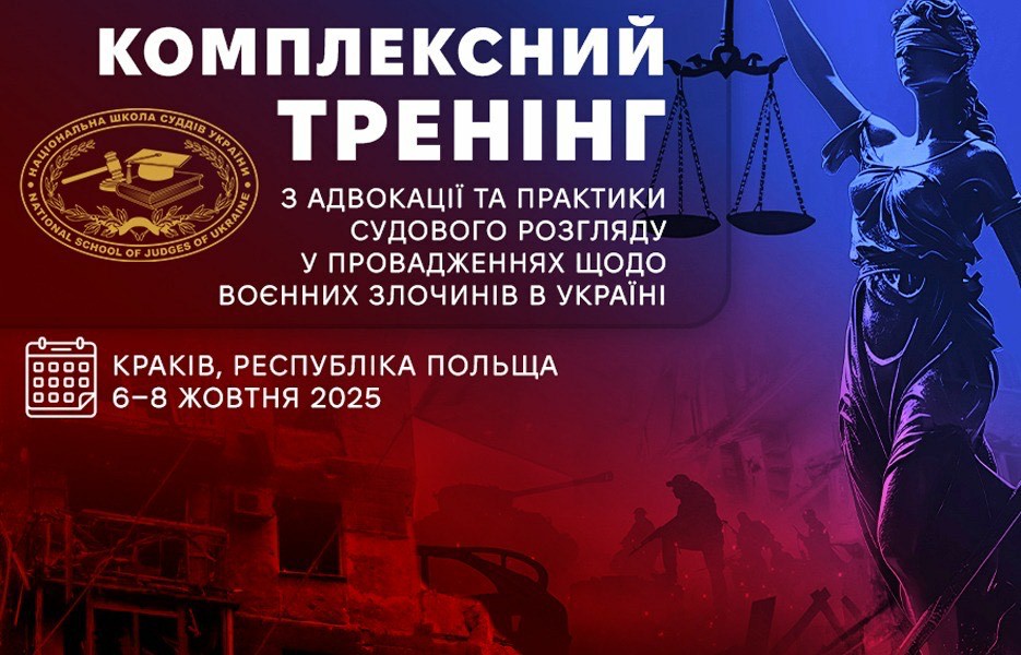 6–8 жовтня 2025 року Національна школа суддів України спільно із Програмою “Розвиток компетентностей для правничого сектору України” проводить дводенний тренінг з адвокації та практики судового розгляду у провадженнях щодо воєнних злочинів в Україні (Краків, Республіка Польща).