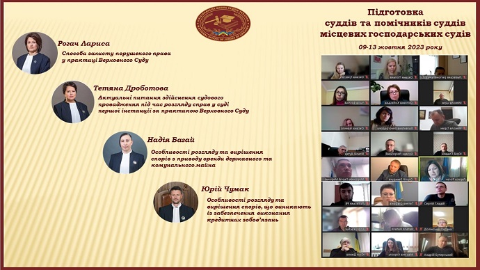 9 жовтня 2023 року Національна школа суддів України розпочала проведення онлайн-підготовки для підтримання кваліфікації суддів та помічників суддів місцевих господарських судів.