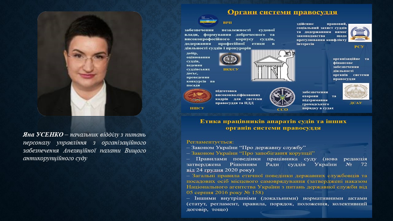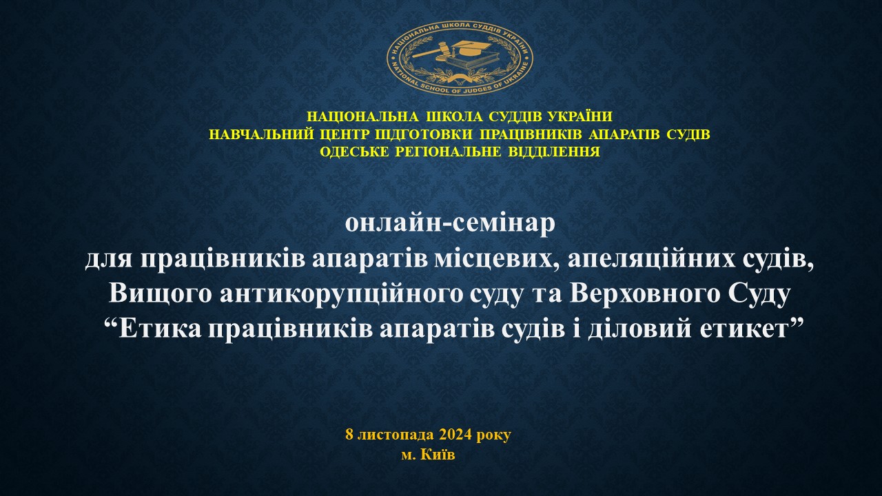 8 листопада 2024 року Національна школа суддів України провела для працівників апаратів місцевих, апеляційних судів, Вищого антикорупційного суду та Верховного Суду онлайн-семінар “Етика працівників апаратів судів і діловий етикет”.