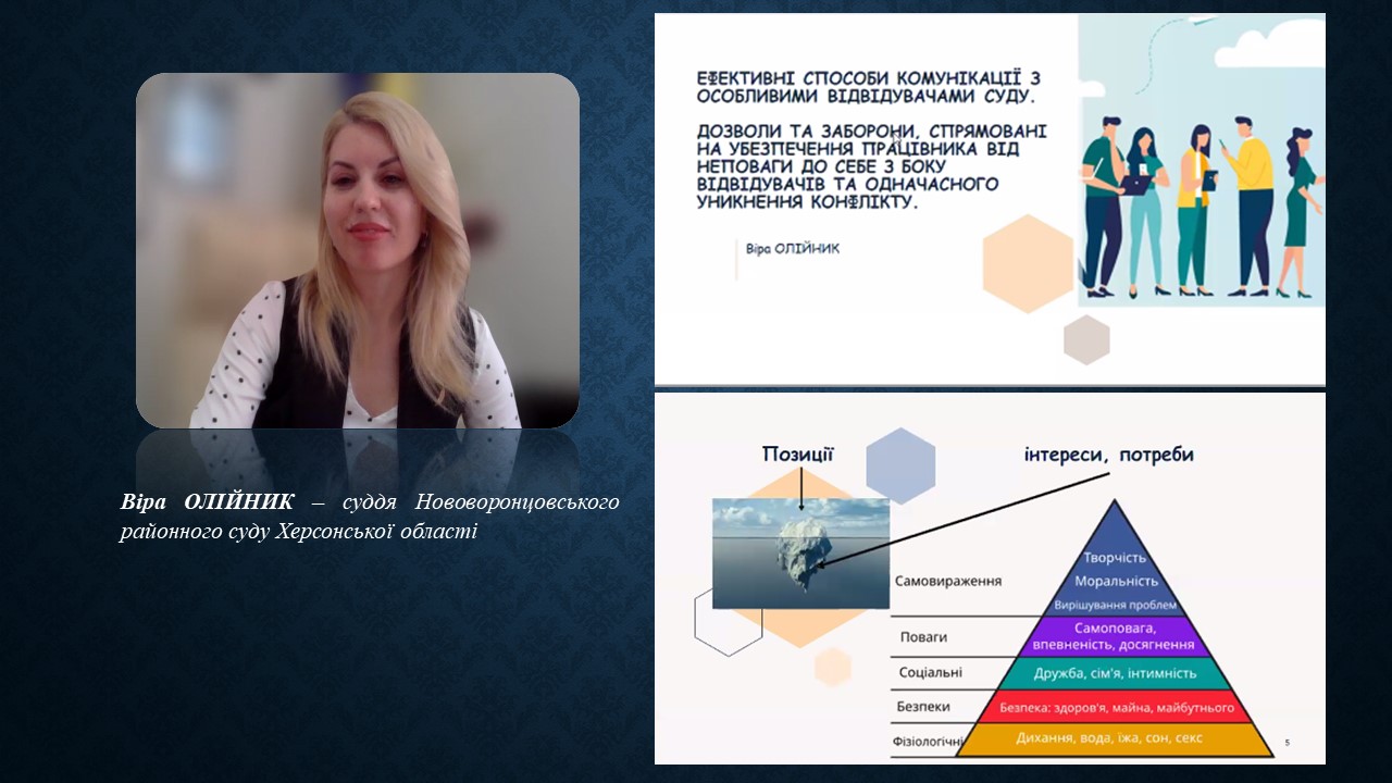 Під час семінару начальниця відділу з питань персоналу управління з організаційного забезпечення Апеляційної палати Вищого антикорупційного суду Яна Усенко ознайомила слухачів з основними положеннями національного законодавства та міжнародними стандартами, що регулюють етичні норми поведінки працівників судів, та зосередила увагу на правилах професійної поведінки, які включають дрескод, стиль спілкування в колективі та етику використання соціальних мереж. Суддя Нововоронцовського районного суду Херсонської області Віра Олійник розповіла про ефективні методи комунікації зі “складними відвідувачами суду”, а також презентувала основні стратегії розв’язання конфліктів та способи подолання стресових ситуацій, які допоможуть працівникам апаратів судів бути професійними у складних ситуаціях, покращуючи якість обслуговування і сприяючи створенню комфортного середовища для відвідувачів.