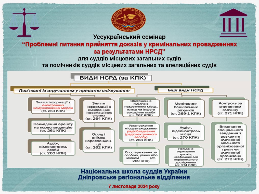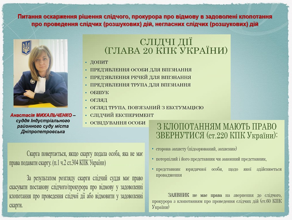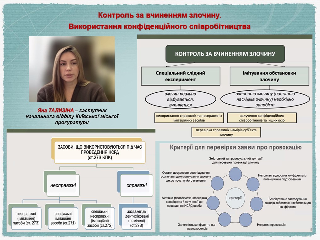 Питання оскарження рішення слідчого, прокурора про відмову в задоволені клопотання про проведення слідчих (розшукових) дій, негласних слідчих (розшукових) підняла у своєму виступі суддя Індустріального районного суду міста Дніпропетровська Анастасія Михальченко, а заступник начальника відділу Київської міської прокуратури Яна Тализіна роз’яснила актуальні питання щодо використання конфіденційного співробітництва і контролю за здійсненням злочину, а саме проведення спеціального слідчого експерименту, імітування обстановки злочину, контрольовані поставки, контрольовані та оперативні закупки.