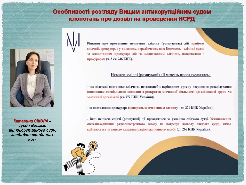 Під час виступу суддя Вищого антикорупційного суду, кандидатка юридичних наук Катерина Сікора звернула увагу слухачів на особливості розгляду Вищим антикорупційним судом клопотань про дозвіл на проведення НСРД.