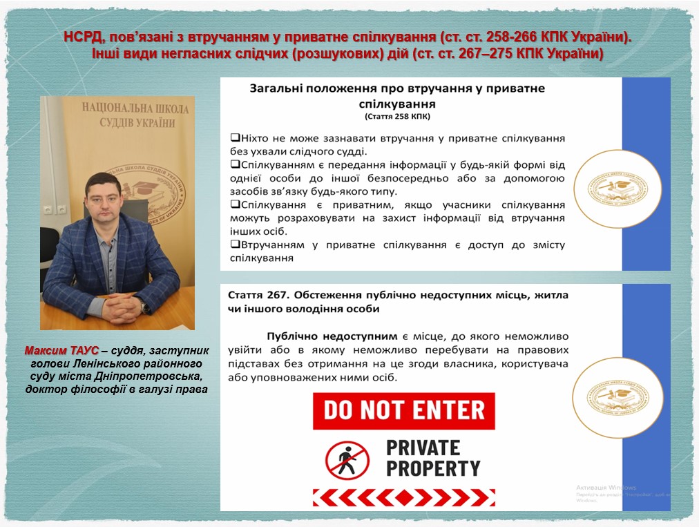 Заступник голови Ленінського районного суду міста Дніпропетровська, доктор філософії в галузі права Максим Таус висвітлив загальні положення про втручання у приватне спілкування, зупинився на різновидах втручання у приватне спілкування, а також розповів про обстеження публічно недоступних місць, житла чи іншого володіння особи, проведення моніторингу банківських рахунків, а під час досудового розслідування тяжкого або особливо тяжкого злочину здійснення прихованої фіксації відомостей за допомогою аудіо- і відеозапису публічно доступних місць, негласне отримання зразків, необхідних для порівняльного дослідження, використання конфіденційного співробітництва.