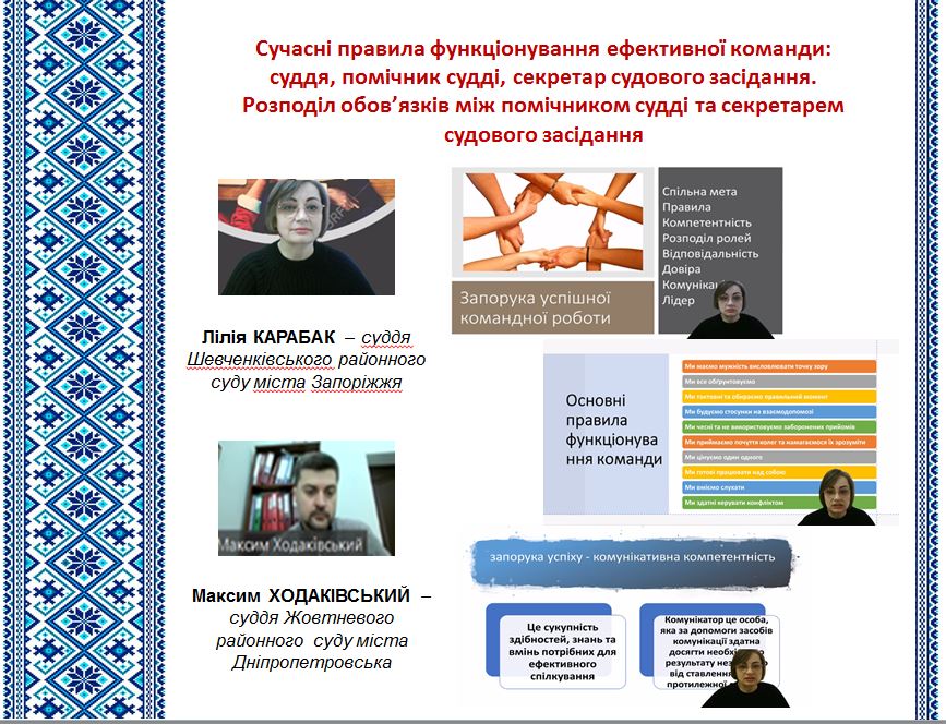 Корисною для професійного зростання буде лекція, яку проведуть суддя Шевченківського районного суду міста Запоріжжя Лілія КАРАБАК і суддя Жовтневого районного суду міста Дніпропетровська Максим ХОДАКІВСЬКИЙ стосовно сучасних правил функціонування ефективної команди (суддя, помічник судді, секретар судового засідання) і правильному розподілу обов’язків між помічником судді та секретарем судового засідання.