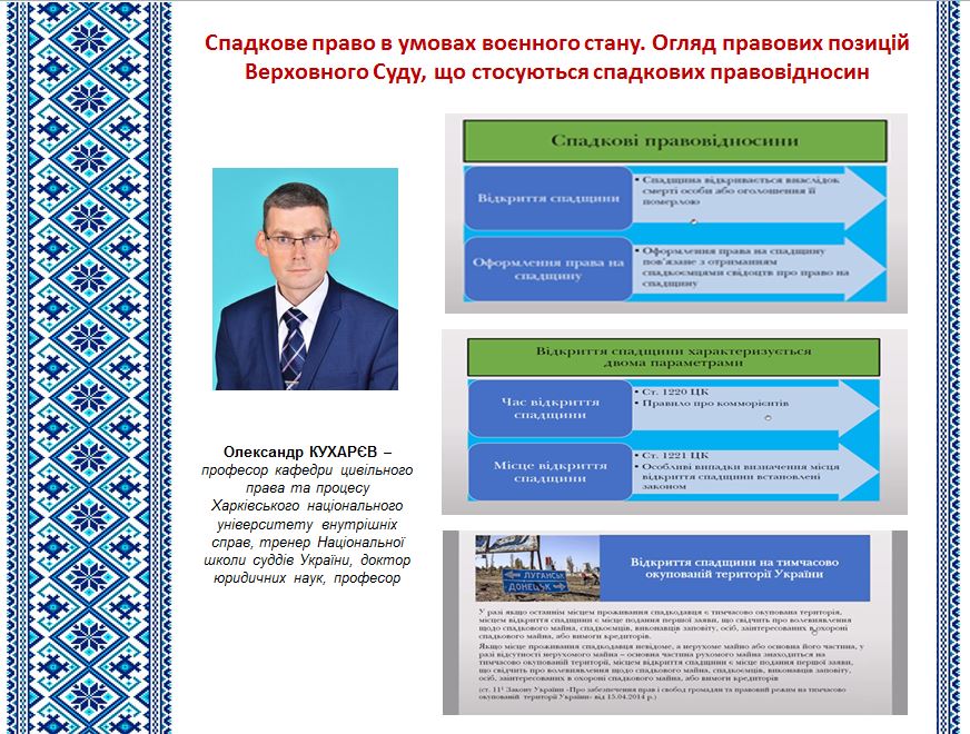 Професор кафедри цивільного права та процесу Харківського національного університету внутрішніх справ, тренер Національної школи суддів України, доктор юридичних наук, професор Олександр КУХАРЄВ під час лекції детально проаналізує правові позиції Верховного Суду, що стосуються спадкових правовідносин.