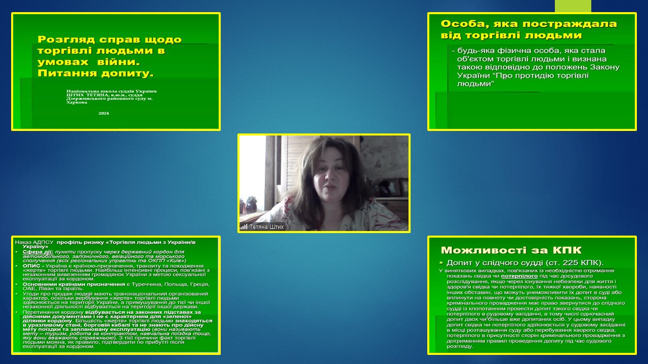 – Розгляд справ щодо торгівлі людьми в умовах війни (викладач: Тетяна Штих);