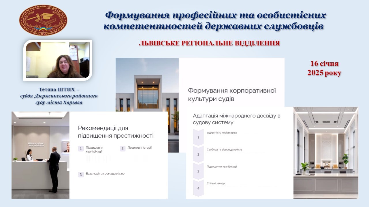 16 січня 2025 року Національна школа суддів України провела для працівників апаратів місцевих та апеляційних судів семінар “Формування професійних та особистісних компетентностей державних службовців”, на якому понад 200 державних службовців підвищили свій кваліфікаційний рівень.