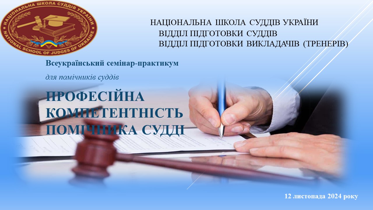 12 листопада 2024 року Національна школа суддів України провела всеукраїнський семінар-практикум для помічників суддів “Професійна компетентність помічника судді”. Концепція навчання полягала в поглибленні знань та розвитку мовної, правової, психологічної, інформаційно-цифрової компетентностей помічника судді.