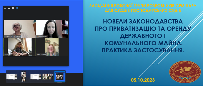 5 жовтня 2023 року Національна школа суддів України провела перше засідання групи розробників семінару для суддів “Новели законодавства про приватизацію та оренду державного і комунального майна. Практика застосування”.