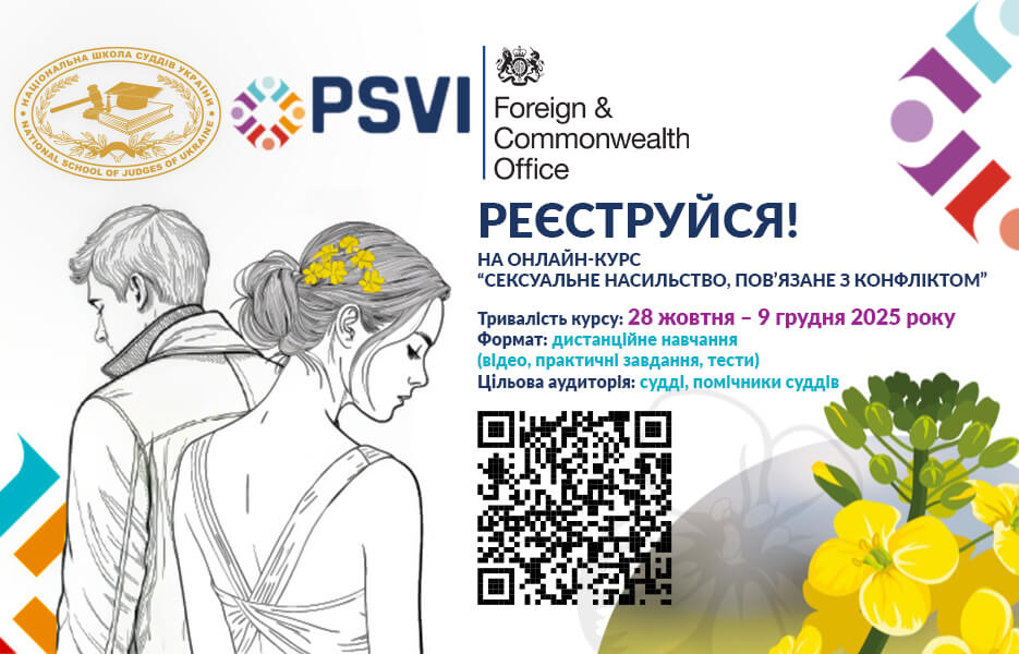 Національна школа суддів України запрошує суддів та помічників суддів взяти участь у дистанційному курсі, розробленому в межах Ініціативи із запобігання сексуальному насильству в умовах конфлікту (PSVI) за підтримки МЗС Великої Британії та у співпраці з НШСУ, Synergy for Justice і Global Rights Compliance.
