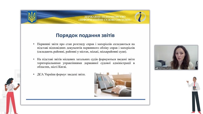 Під час заходу Тетяна Снігур зробила для слухачів загальний огляд звітності щодо стану здійснення правосуддя місцевими та апеляційними судами, розповіла про форми звітності місцевого загального суду та практичні аспекти ведення судової статистики в автоматизованій системі документообігу суду. Ольга Лещенко обговорила проблемні питання роботи із статистичними картками в автоматизованій системі документообігу суду та формуванні статистичних звітів. Тетяна Потапчук у своїй доповіді детально проаналізувала етапи підготовки аналітичного огляду на підставі даних квартальної та річної звітності, висвітлила особливості підготовки огляду обліково-статистичної роботи в суді та огляду даних судової статистики про стан здійснення правосуддя.