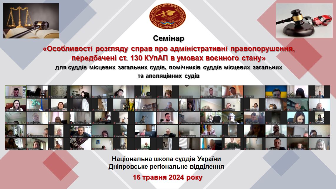 16 травня 2024 року Дніпровське регіональне відділення Національної школи суддів України проводить семінар для суддів місцевих загальних судів і помічників суддів місцевих загальних та апеляційних судів “Особливості розгляду справ про адміністративні правопорушення, передбачені ст. 130 КУпАП в умовах воєнного стану” в режимі онлайн.