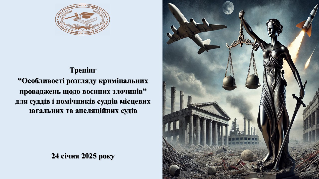 24 січня 2025 року Національна школа суддів України провела тренінг “Особливості розгляду кримінальних проваджень щодо воєнних злочинів” для суддів і помічників суддів місцевих загальних та апеляційних судів.