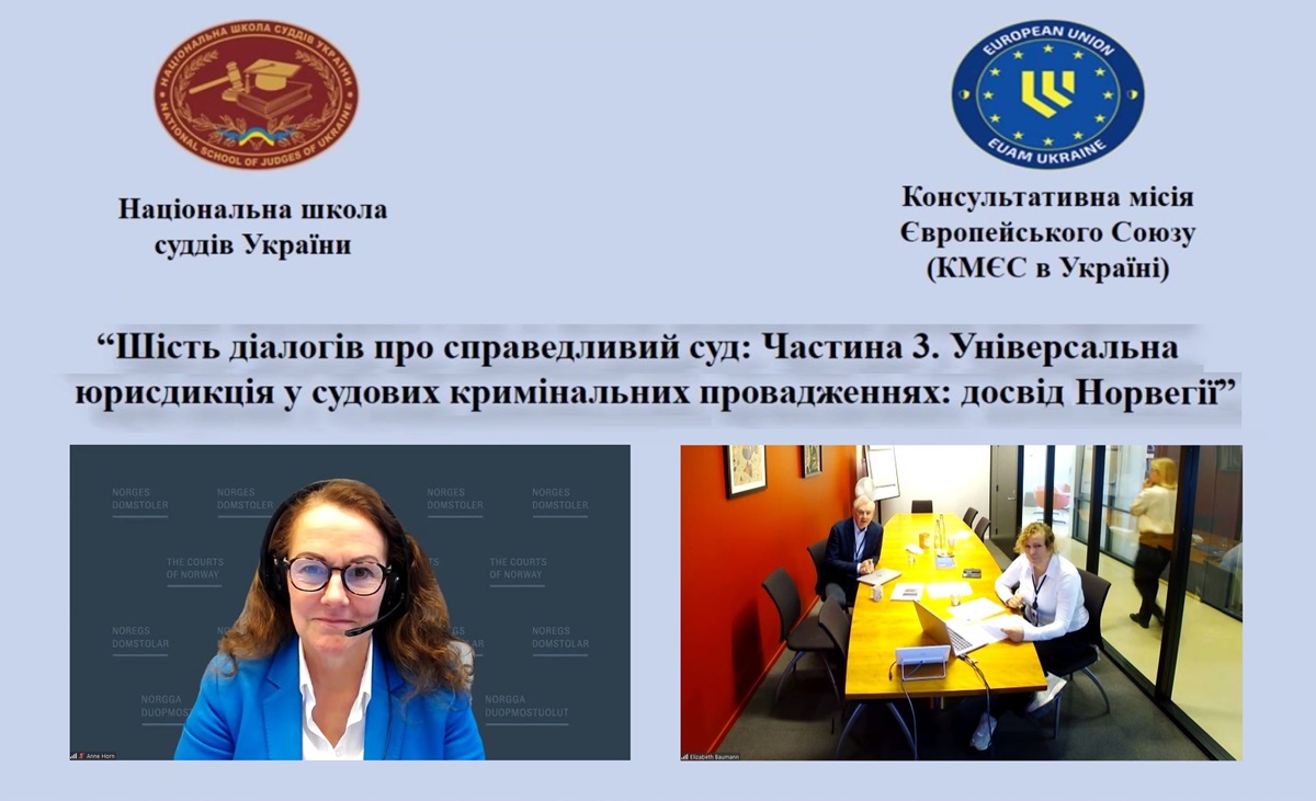 7 листопада 2024 року Національна школа суддів України спільно із Консультативною місією Європейського Союзу (КМЄС) з реформування сектору цивільної безпеки України провела третій із серії тематичних онлайн-семінарів для суддів місцевих загальних та апеляційних судів, суддів Верховного Суду “Шість діалогів про справедливий суд: Частина 3. Універсальна юрисдикція у судових кримінальних провадженнях: досвід Норвегії”.