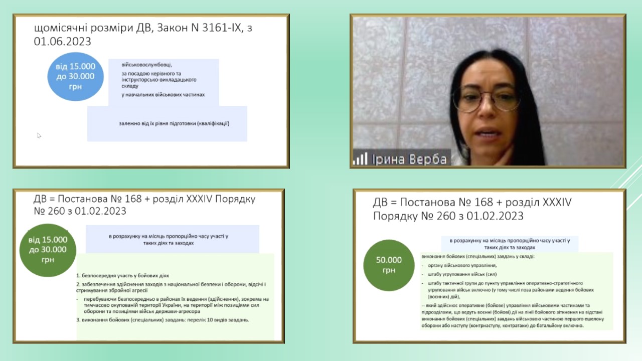 Предметом обговорення були питання розгляду спорів щодо нарахування та виплати додаткової грошової винагороди; проблемні аспекти судових спорів щодо відмов у розгляді рапорту солдата командиром, військовою частиною та оскарження наказів про передислокацію військової частини, переведення у іншу військову частину військовослужбовців; питання щодо переведення атестованих працівників системи МВС за наказом начальника у іншу місцевість, на територію бойових дій; порядок звільнення військовослужбовця зі служби в особливий період під час дії воєнного стану; актуальні позиції Верховного Суду щодо розгляду спорів про виплату одноразової грошової допомоги внаслідок смерті військовослужбовця; особливості застосування положень процесуального права у справах за участі військовослужбовців; проблемні питання, пов’язані з викликами та повідомленнями військових частин за позовами військових.