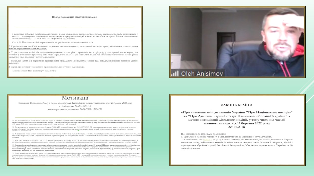 20 жовтня 2023 року Національна школа суддів України провела семінар-практикум “Актуальні питання застосування норм матеріального та процесуального права адміністративними судами при розгляді публічно-правових спорів за участю військовослужбовців та інших осіб під час воєнного стану” у межах підготовки для підтримання кваліфікації суддів окружних адміністративних судів.