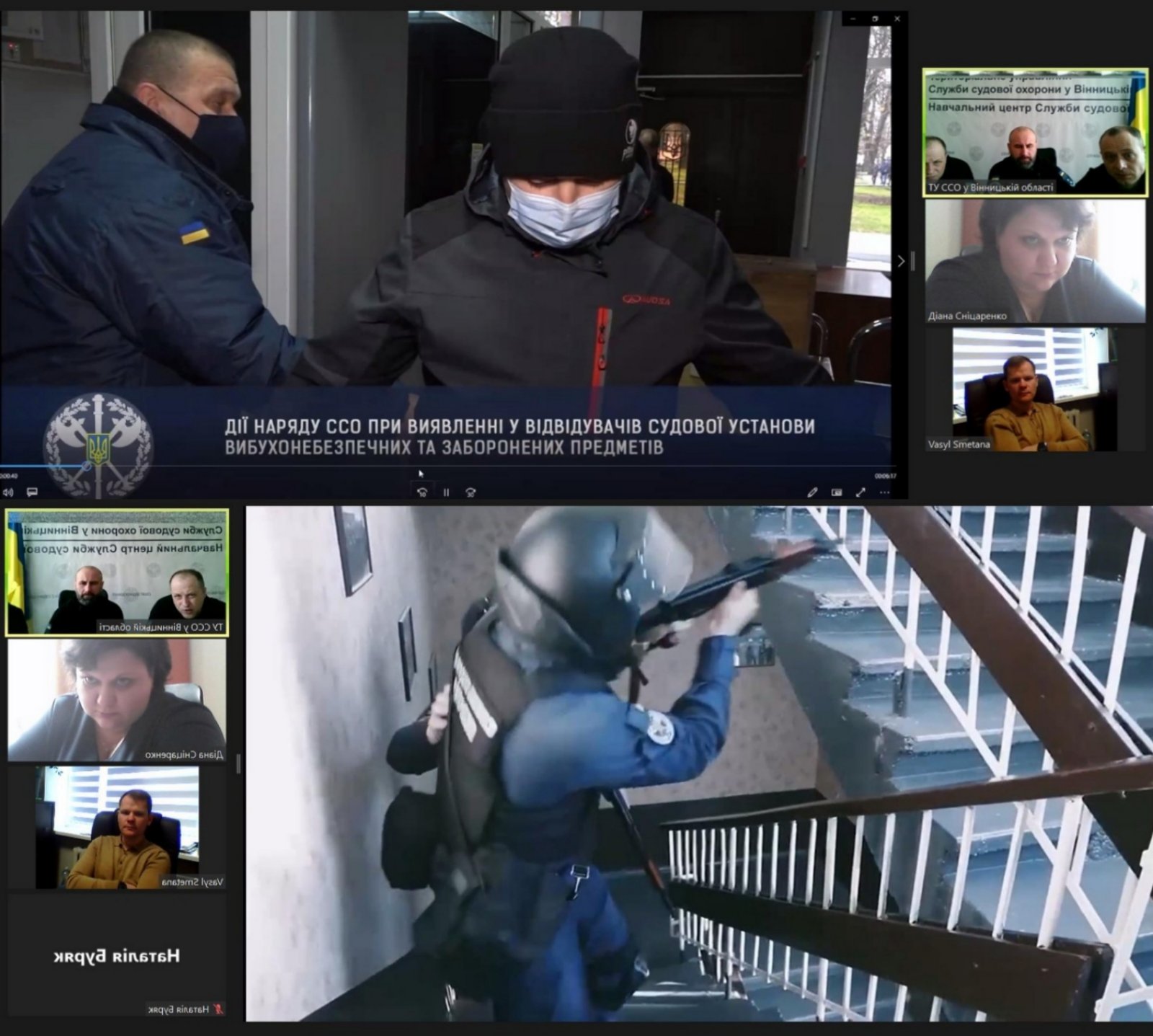 Координувала роботу групи заступниця начальника відділу спеціальної підготовки кандидатів на посаду судді Діана Сніцаренко, а участь в онлайн–засіданні взяли суддя Горохівського районного суду Волинської області Василь Сметана та співробітники територіального управління Служби судової охорони у Вінницькій області Руслан Кривоніс, Віталій Шведа, Валентин Мазур.